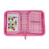 Na dwóch rozkładanych klapkach znalazły się 35 elastyczne, gumowe uchwyty, na kredki, długopisy, markery, gumkę, nożyczki, cyrkiel i nne przybory.