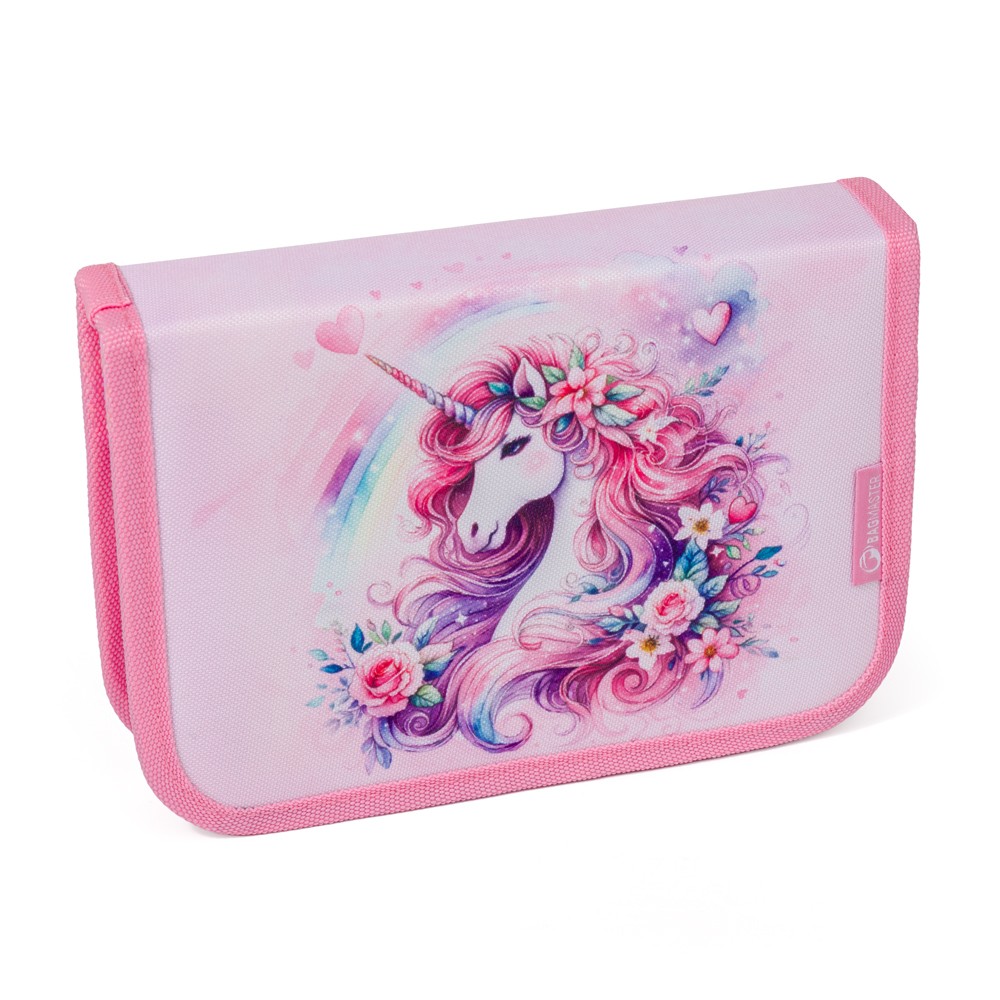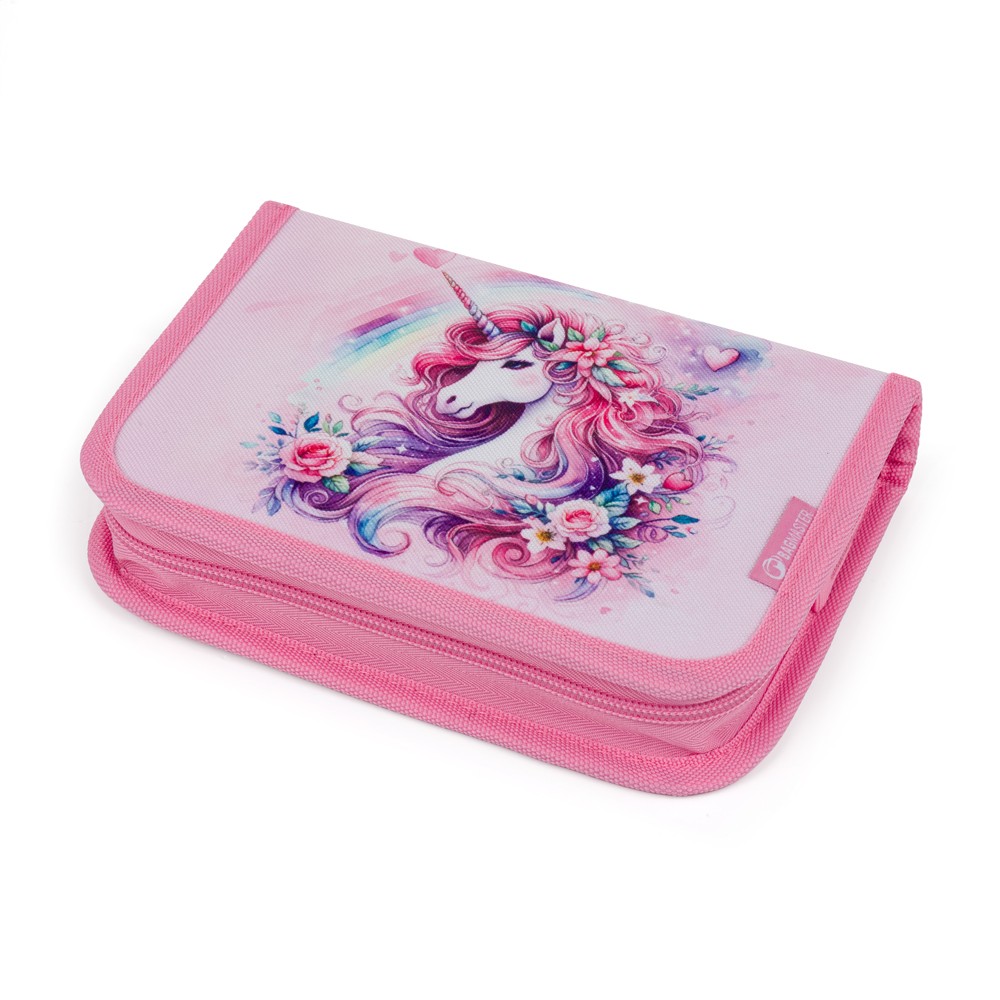 Wesoły piórnik z jednorożcem odpowiedni dla małych uczennic w pierwszej klasie. Wyposażony w wiele gumowych uchwytów na dwóch klapach. Daje wystarczająco dużo miejsca na wszystkie niezbędne przybory szkolne. Zamykany jest na wysokiej jakości zamek błyskawiczny. Jest lekki i nie zajmuje dużo miejsca w plecaku.