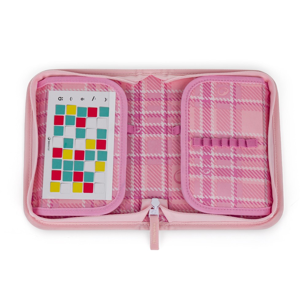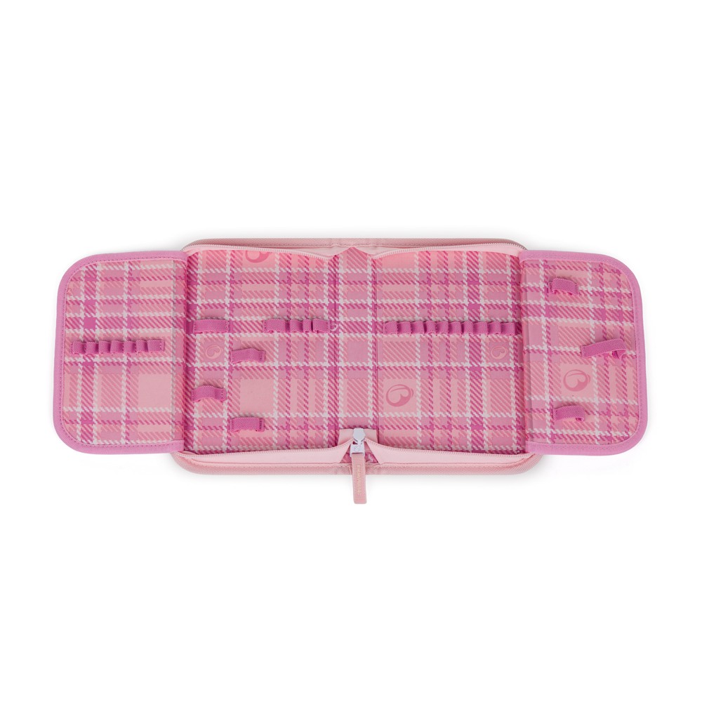 Na dwóch rozkładanych klapkach znalazły się 35 elastyczne, gumowe uchwyty, na kredki, długopisy, markery, gumkę, nożyczki, cyrkiel i nne przybory.