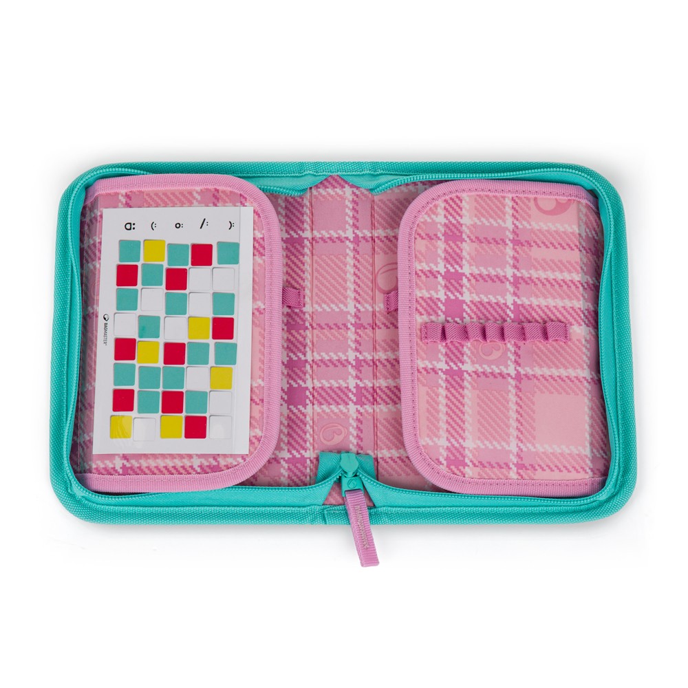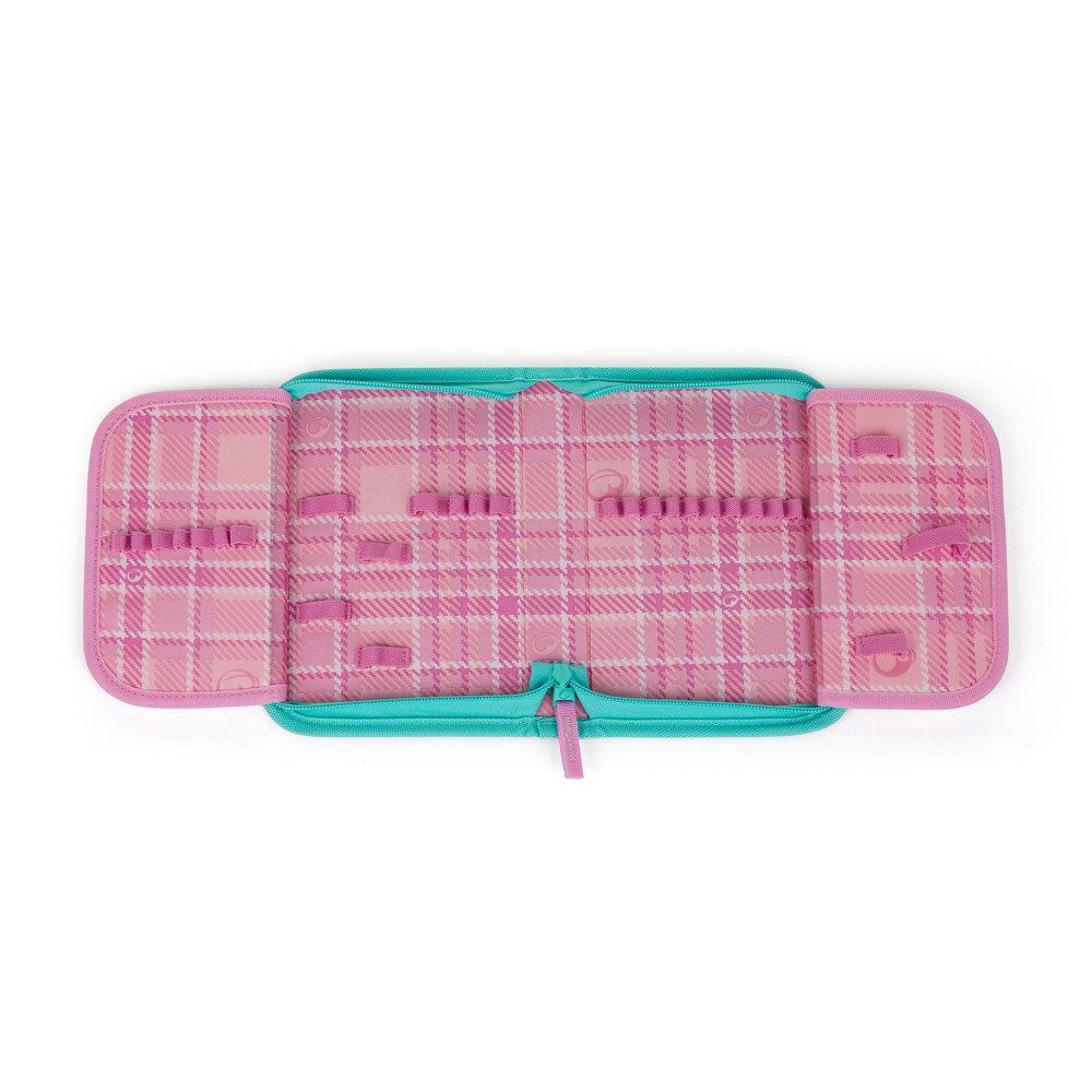 Na dwóch rozkładanych klapkach znalazły się 35 elastyczne, gumowe uchwyty, na kredki, długopisy, markery, gumkę, nożyczki, cyrkiel i nne przybory.